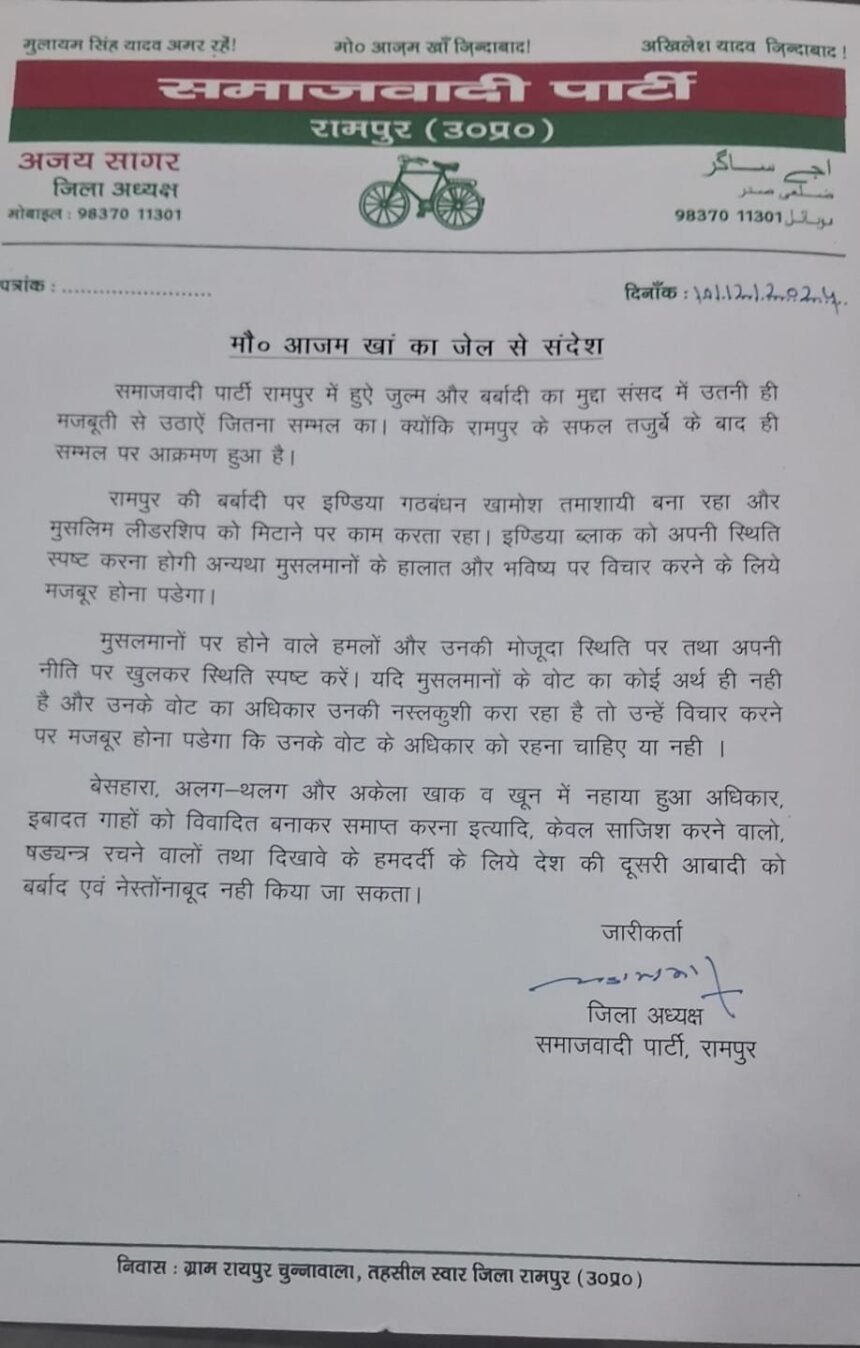 *रामपुर न्यूज़ रामपुर समाजवादी पार्टी के जिला अध्यक्ष अजय सागर द्वारा जारी संदेश में वरिष्ठ नेता मोहम्मद आजम खां का जेल से भेजा गया बयान सार्वजनिक किया गया है।